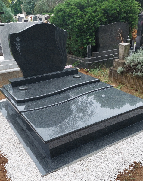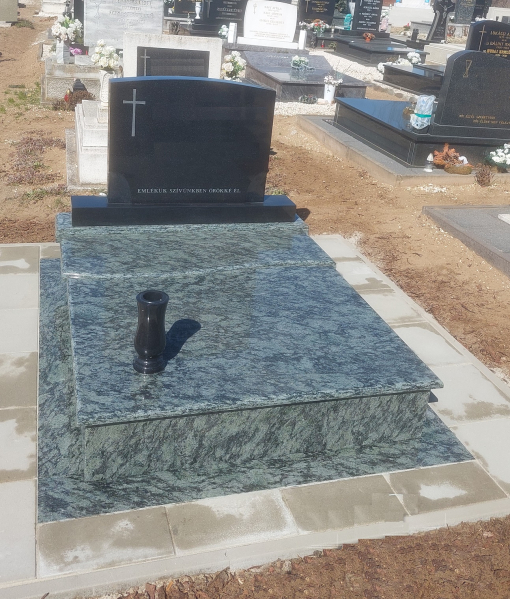 Nero Impala dupla gránit síremlék, borított járdával, középen domborított berakású dupla fedlappal, süllyesztett vázákkal, oldalt ’legyező’ motívumú emlékkel